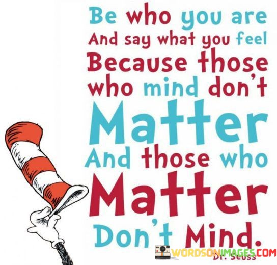 The quote, "Be who you are and say what you feel because those who mind don't matter and those who matter don't mind," encapsulates a powerful message about self-acceptance, authenticity, and the importance of surrounding oneself with genuine and supportive individuals. It encourages us to embrace our true selves and express our thoughts and emotions freely, without fear of judgment or rejection. The quote highlights that those who truly value and care for us will accept and appreciate us for who we are, while those who criticize or disapprove are not worth altering our authenticity to please. By living authentically and speaking our truth, we cultivate deeper connections with like-minded individuals who cherish us for our genuine selves, fostering meaningful relationships built on trust, understanding, and mutual respect. Ultimately, the quote serves as a reminder to prioritize our self-worth and to be unapologetically true to ourselves, as it is in being authentic that we attract the right people into our lives and nurture connections that enrich and empower us. At its core, the quote celebrates the value of self-acceptance and the liberation that comes with embracing our true selves. It encourages us to shed the burden of trying to conform to others' expectations or opinions, empowering us to live in alignment with our core values, beliefs, and emotions. Moreover, the quote speaks to the significance of authenticity in fostering genuine and supportive relationships. By being true to ourselves and expressing our thoughts and feelings honestly, we attract individuals who resonate with our authentic selves. These like-minded individuals become a source of strength and encouragement, forming meaningful connections built on trust, understanding, and acceptance. Furthermore, the quote underscores the importance of not being swayed by the judgments of others. It reminds us that the opinions of those who criticize or disapprove of us are inconsequential, as their opinions do not define our self-worth or validity. Instead, we should prioritize the opinions of those who truly matter to us, those who genuinely appreciate and respect us for who we are. In conclusion, the quote "Be who you are and say what you feel because those who mind don't matter and those who matter don't mind" celebrates the power of authenticity and self-acceptance. By embracing our true selves and expressing our thoughts and emotions freely, we attract individuals who resonate with our authentic selves and form meaningful connections with like-minded souls. This quote serves as a reminder to prioritize our self-worth and to be unapologetically true to ourselves, as it is in being authentic that we cultivate enriching relationships and nurture connections that empower us. By living authentically and speaking our truth, we create a space for genuine and supportive relationships, surrounded by individuals who cherish and value us for who we are, encouraging us to thrive and grow in a community of mutual understanding and acceptance.