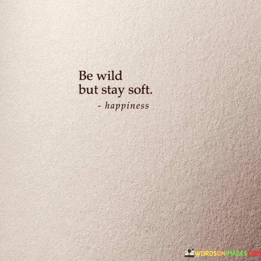 The quote "Be Wild But Stay Soft" carries a dual message about balancing one's personality and approach to life. It suggests that while it's important to embrace a sense of adventure, spontaneity, and a free spirit ("be wild"), it's equally crucial to maintain a sense of gentleness, compassion, and sensitivity ("stay soft").