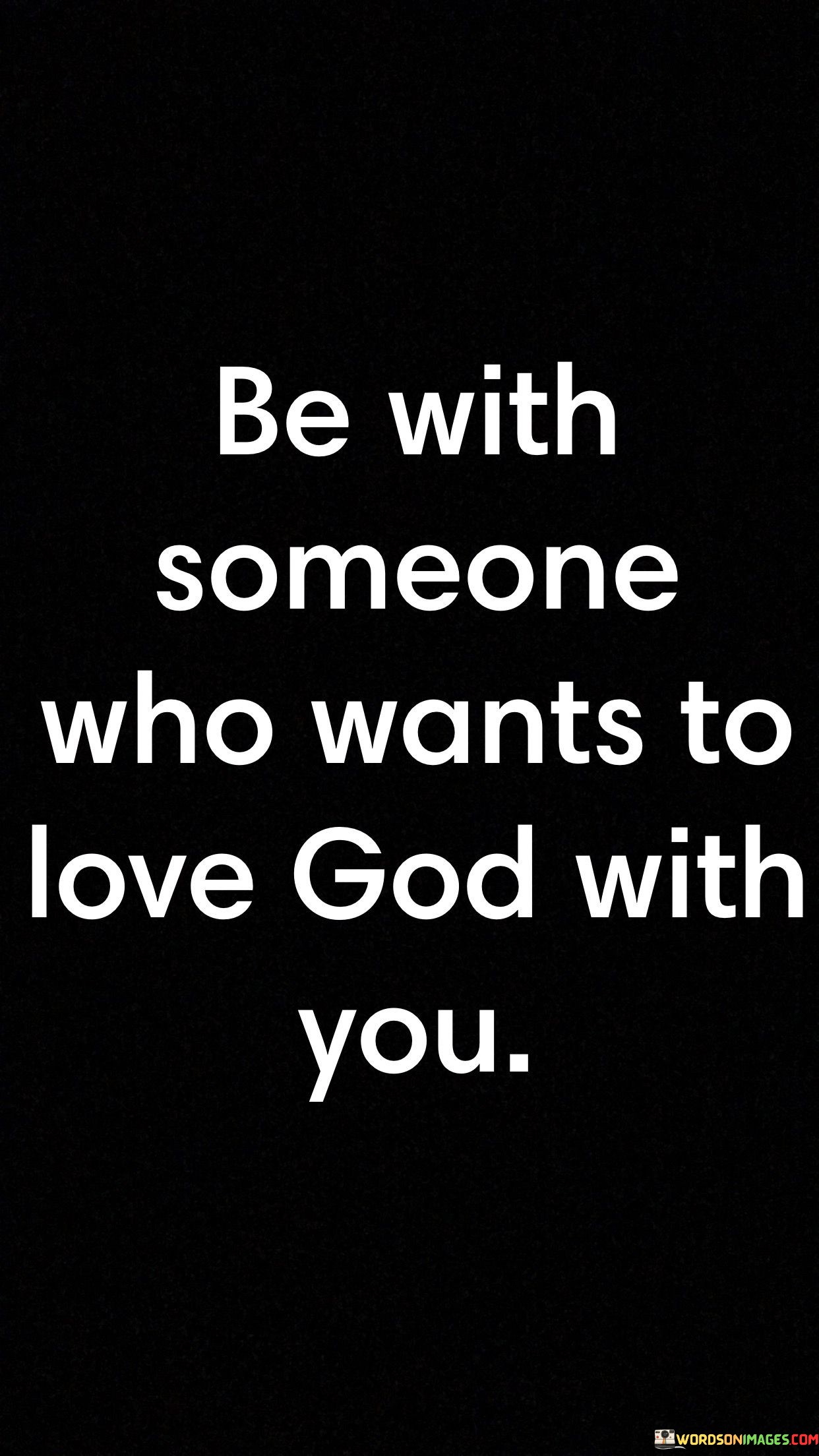 The quote "Be with someone who wants to love God with you" emphasizes the importance of having a partner who shares your spiritual values and desires to grow in faith together. This sentiment suggests that a deep and harmonious connection in a relationship can be fostered when both individuals are aligned in their spiritual journeys.