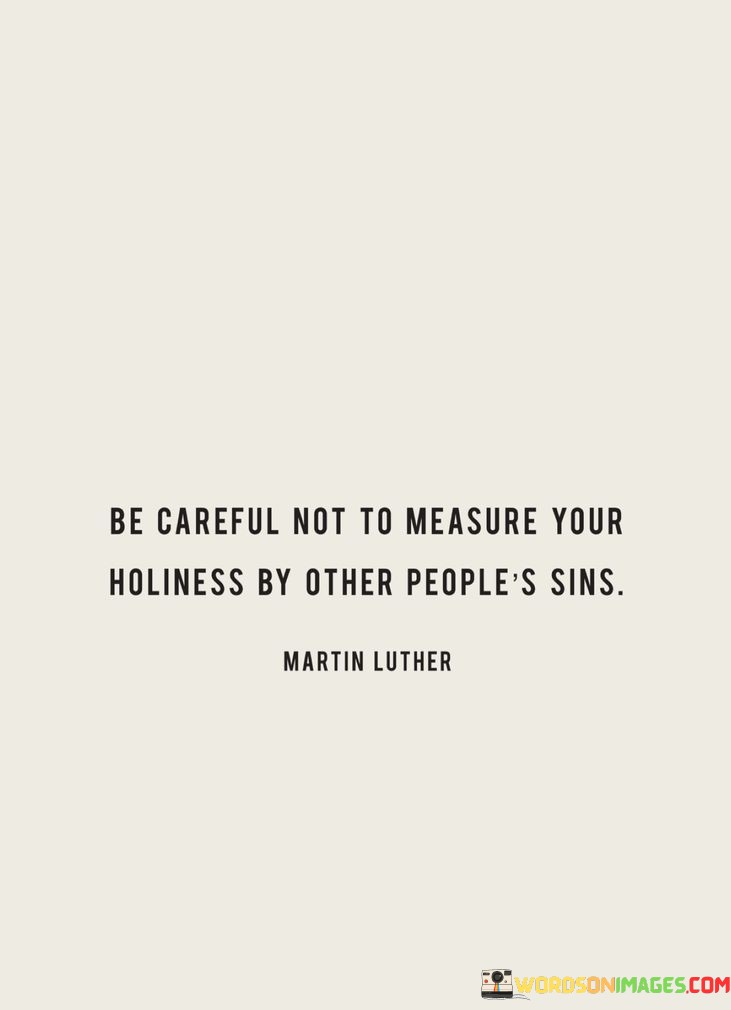The quote "Be careful not to measure your holiness by other people's sins" advises us not to judge our own moral or spiritual standing based on the wrongdoings of others. It encourages us to maintain our sense of righteousness independently of the actions of those around us.