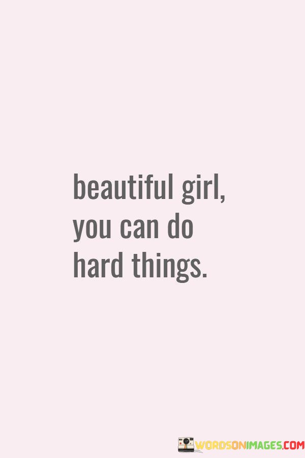 The quote "Beautiful Girl You Can Do Hard Things" is a powerful message of encouragement and empowerment, specifically directed towards a young woman. In just eight words, it delivers a profound message that highlights a person's inner strength and resilience. It reminds the individual that they have the capacity to overcome challenges and obstacles in life, regardless of their gender.