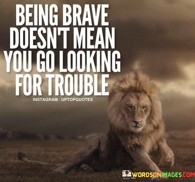 The quote, "Being brave doesn't mean you go looking for trouble," encapsulates a profound insight about the true nature of courage and bravery. It dispels the misconception that bravery involves seeking out dangerous or risky situations. Instead, the quote emphasizes that genuine bravery is not about recklessness or intentionally putting oneself in harm's way; rather, it is the ability to face challenges, adversity, and difficult situations with courage and determination when they arise. True bravery lies in standing up for what is right, facing fears, and persevering through adversity, even when it would be easier to avoid or escape. It underscores the importance of exercising wisdom and discernment in choosing our battles and not seeking unnecessary confrontations. By understanding that bravery is not about actively seeking trouble but rather about responding courageously when challenges come our way, we cultivate a deeper appreciation for the strength and resilience required to navigate life's obstacles and adversities. Ultimately, the quote serves as a reminder that true bravery is a virtue grounded in wisdom, self-awareness, and a willingness to confront challenges with integrity and determination, rather than seeking trouble or acting impulsively. At its core, the quote celebrates the distinction between bravery and recklessness. Bravery involves the willingness to confront difficult situations, take risks, and face fears when necessary, but it does not entail seeking out trouble or danger for its own sake. It emphasizes the importance of measured and thoughtful action rather than acting on impulses or seeking unnecessary confrontation. Moreover, the quote speaks to the importance of wisdom and discernment in displaying bravery. Being brave means understanding when it is appropriate to take a stand, assert oneself, or face challenges, and when it is wiser to step back or find alternative solutions. It acknowledges the significance of considering the potential consequences of our actions and the impact they may have on ourselves and others. Furthermore, the quote underscores the essence of inner strength and resilience in demonstrating bravery. True bravery requires mental fortitude and emotional courage to confront difficulties and adversity, even when it may be intimidating or uncomfortable. In conclusion, the quote "Being brave doesn't mean you go looking for trouble" enlightens us about the true essence of bravery. It reminds us that genuine bravery is not about seeking out dangerous or troublesome situations, but rather about having the courage and determination to face challenges and adversity when they arise. Bravery involves exercising wisdom and discernment, knowing when to take action and when to step back, and exhibiting inner strength and resilience in the face of difficulties. By understanding the distinction between bravery and recklessness, we cultivate a deeper appreciation for the virtue of courage and the importance of responding with integrity and determination to life's challenges. This quote serves as a powerful reminder that true bravery is grounded in wisdom, self-awareness, and a commitment to facing life's obstacles with courage and determination, rather than seeking trouble or acting impulsively.