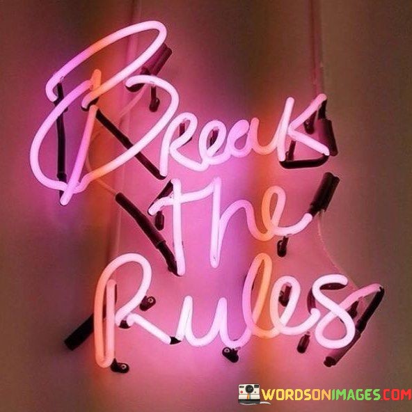 The quote "Break The Rules" suggests a bold and unconventional approach to life. It encourages individuals to challenge the norms, conventions, and limitations that society often imposes. By breaking the rules, it means not conforming to traditional expectations and having the courage to explore new ideas, paths, and possibilities.