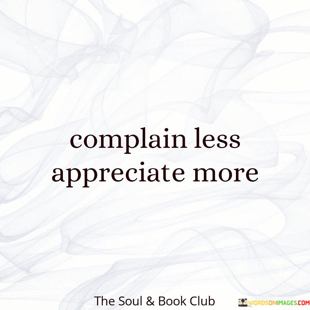 In life, it's easy to find things to complain about. Complaining means expressing dissatisfaction or unhappiness about something. However, this quote encourages us to do less of that and instead focus on appreciating what we have. Appreciation means recognizing and valuing the good things in our lives. So, in simple terms, it's saying that we should spend less time grumbling about what's wrong and more time being thankful for what's right.