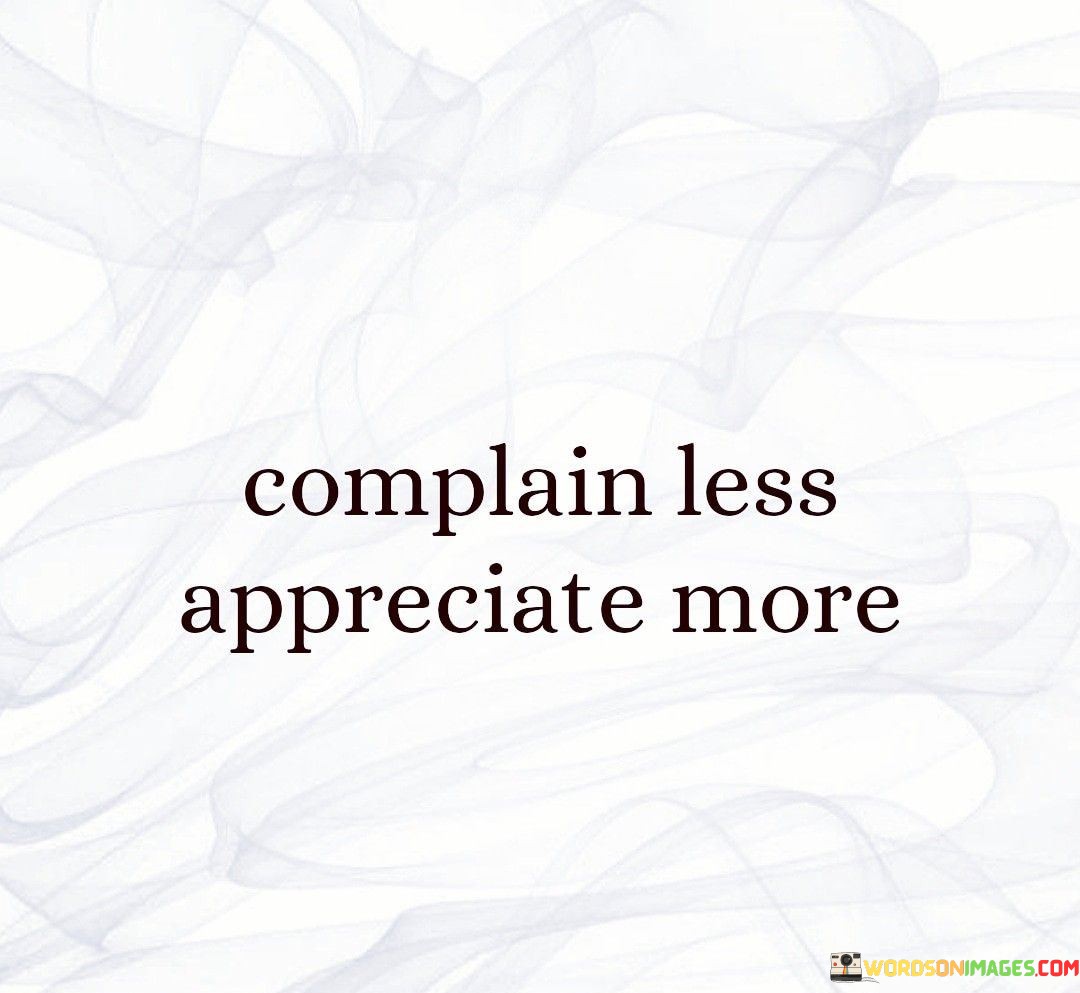 Cut down on complaining and increase your appreciation – that's the essence of this quote. Instead of focusing on what's wrong or lacking in your life, shift your perspective to acknowledge and be grateful for what you have. Complaining often leads to negativity and drains your energy, while appreciating more can bring positivity and contentment.