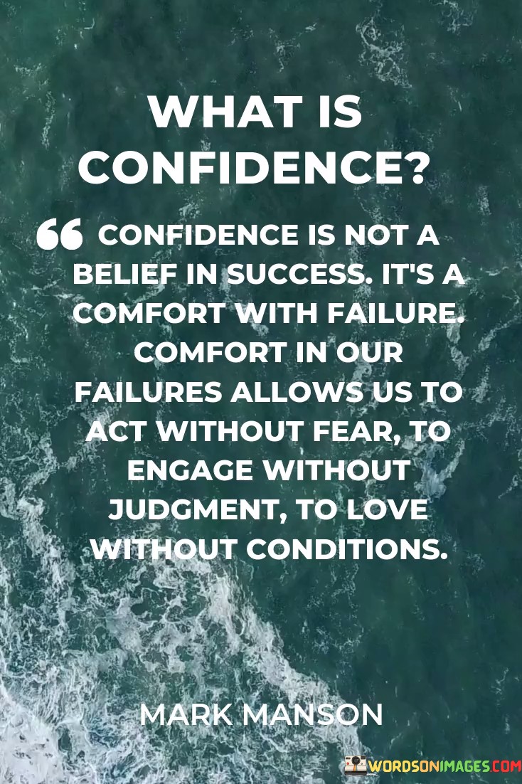 In essence, the quote emphasizes that true confidence doesn't arise solely from successes, but from embracing and learning from failures. It underscores how being at peace with one's shortcomings enables them to live and interact authentically, unburdened by fear or judgment.