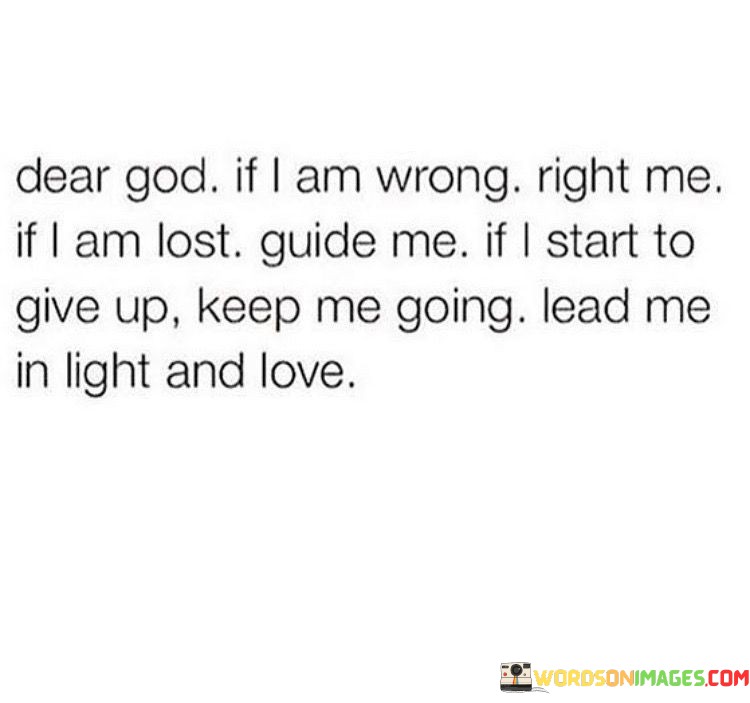 In essence, "Dear God, if I am wrong, right me; if I am lost, guide me; if I start to give up, keep me going; lead me in light and love" reflects a profound reliance on God's guidance and love in navigating life's journey. It signifies a willingness to surrender to divine wisdom and grace, seeking strength and direction in moments of doubt and difficulty.