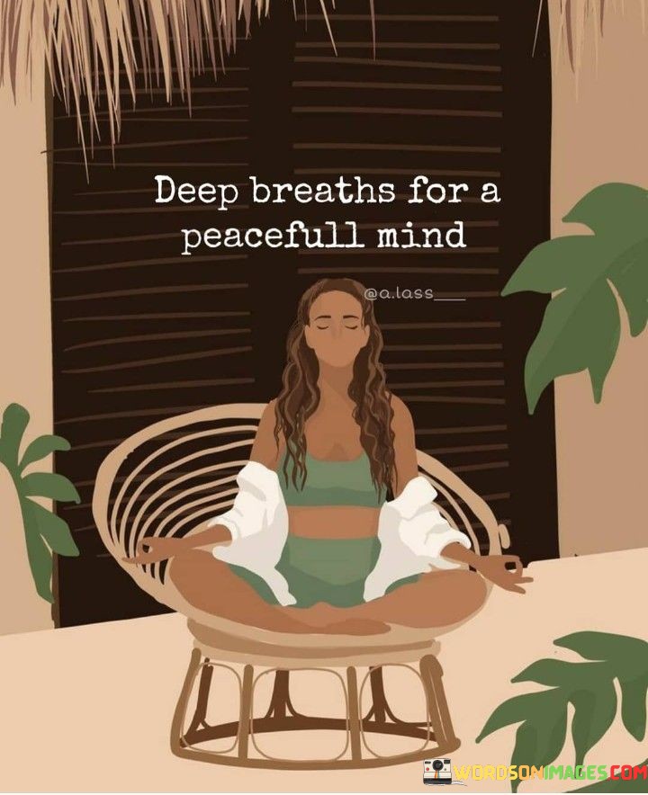 The quote "Deep Breaths For A Peaceful Mind" offers a straightforward and practical message about finding inner peace and calmness. In simpler terms, it suggests that taking deep breaths can help you achieve a peaceful state of mind. When you consciously inhale and exhale deeply, it can have a calming effect on your thoughts and emotions.