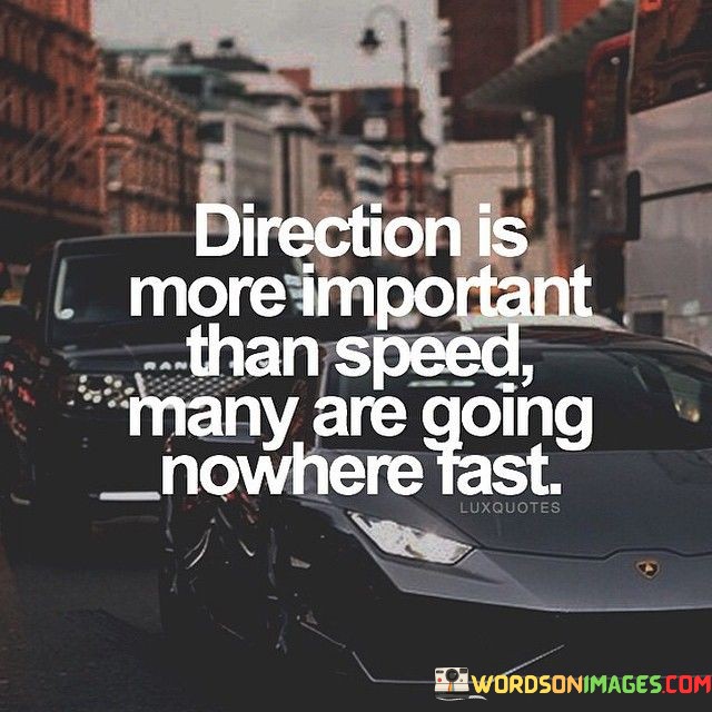 This quote prioritizes purposeful movement. "Direction is more important" underscores mindful navigation. "Than speed" contrasts rapidity. It highlights that progress without purpose is ineffective, emphasizing the significance of having clear goals and intentions to avoid aimless pursuits that yield minimal results.