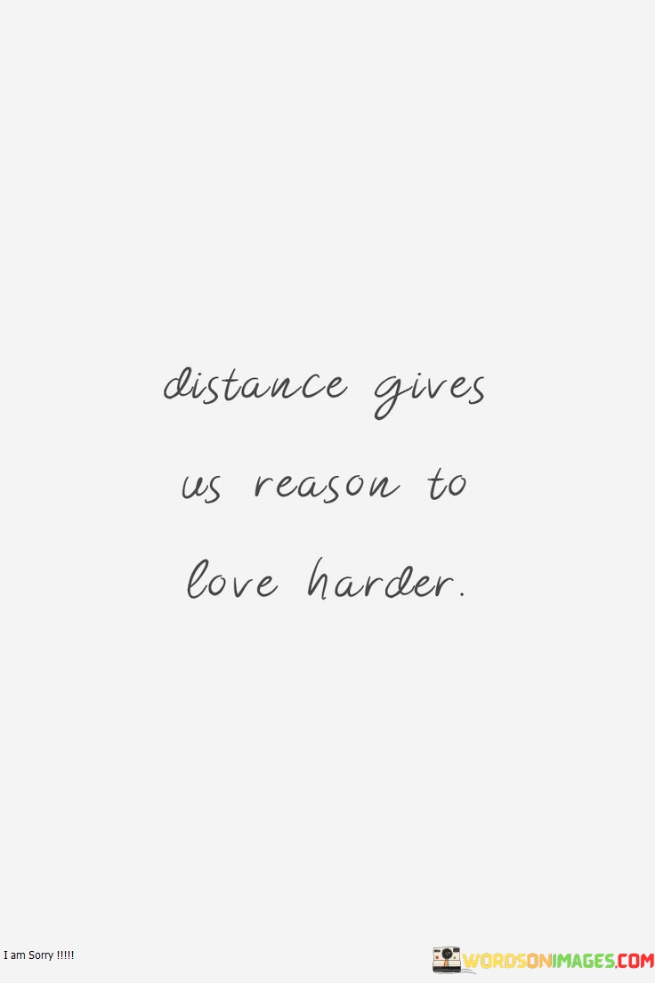The quote "Distance Gives Us Reason To Love Harder" highlights the notion that physical or emotional separation can actually strengthen the bonds of love. When we are physically apart from someone we care about, it can create a yearning and longing that intensify our feelings. This separation becomes a catalyst for us to put in extra effort and show our love more profoundly when we do have the opportunity to connect.