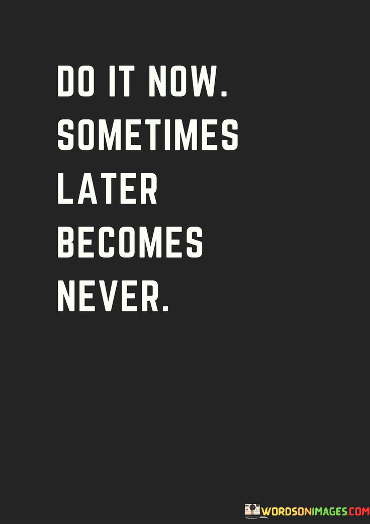 Take action immediately to avoid it slipping away. Embrace the opportunity, for waiting may erase possibilities. Instant action averts later remorse. Start promptly to evade eventual abandonment. Initiate now to prevent potential inactivity. Seize the moment to forestall future regrets. Immediate action wards off the possibility of never doing it.