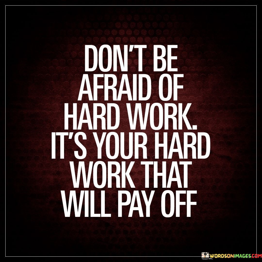 This quote advises against fearing hard work and emphasizes that the efforts you invest will ultimately lead to success. It encourages embracing challenges and putting in the necessary dedication and effort, as these are the factors that contribute to achieving your goals.
