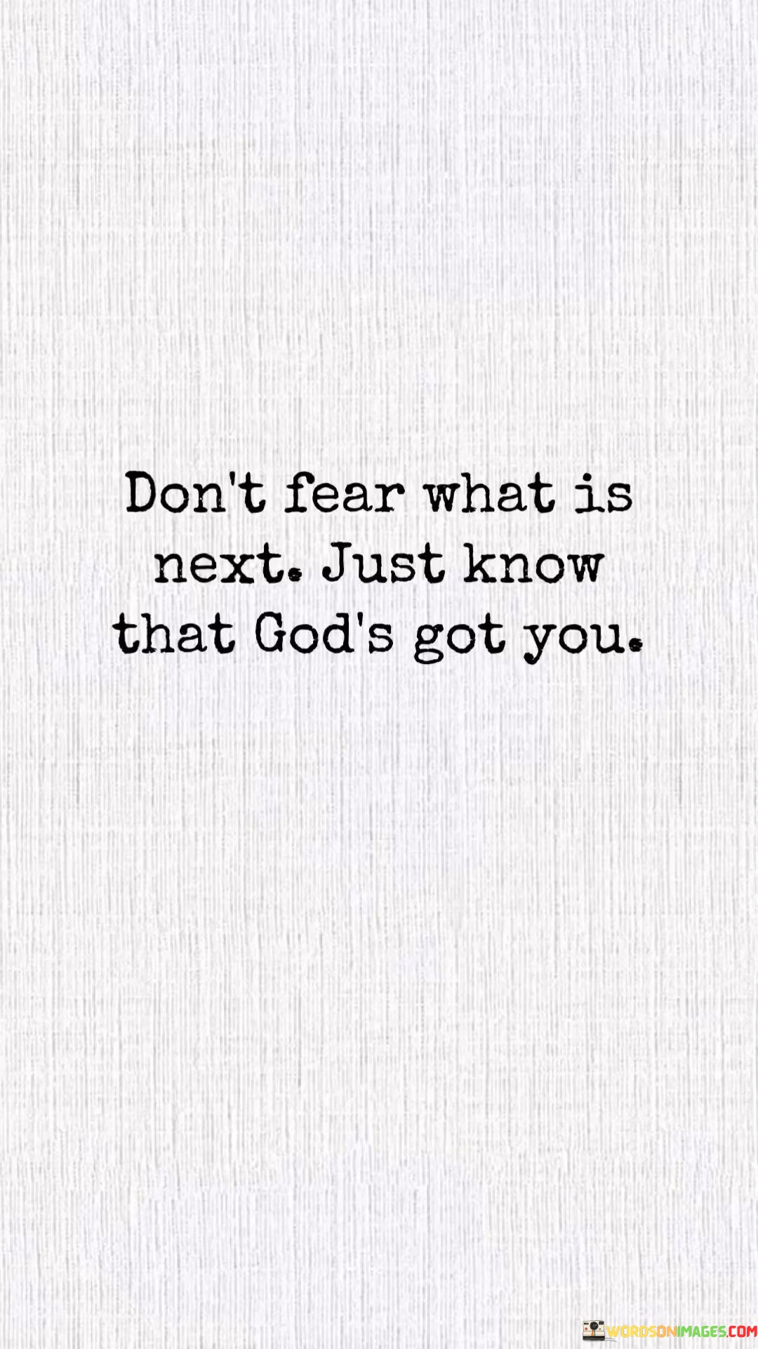 The phrase "Don't fear what is next" encourages individuals not to be consumed by anxiety or worry about the future. Instead, it advises a mindset of courage and confidence in the face of the unknown.
