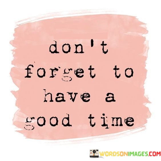 This quote, "Don't Forget To Have A Good Time," reminds us not to overlook the importance of enjoying life. It's like a friendly reminder to not get so caught up in our daily tasks and worries that we forget to have fun. Life can be busy and stressful, but this quote encourages us to make time for happiness and relaxation.