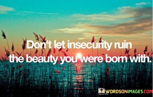 The quote urges individuals not to let their insecurities diminish the natural beauty and uniqueness they possess. It reminds us that everyone is born with inherent beauty, whether physical or inner qualities, and that self-doubt should not overshadow this inherent value.