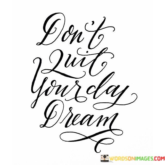 "Don't Quit Your Day Dream" is a simple yet profound message that encourages us to hold on to our aspirations and never abandon the pursuit of our deepest desires. It implies that our dreams, far from being mere fantasies, are worthy of our commitment and effort, even as we navigate the practicalities of our everyday lives.