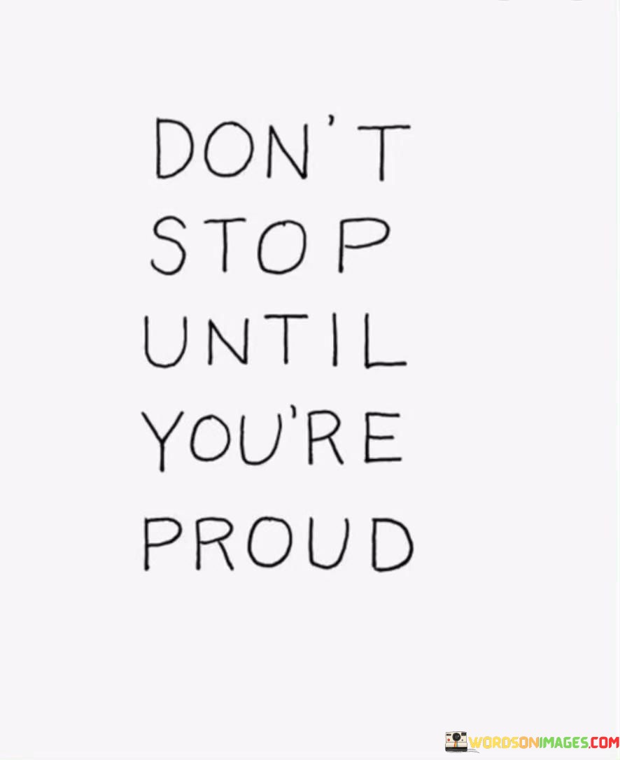 The quote "Don't Stop Until You're Proud" is a motivational statement that encourages perseverance and self-improvement. It implies that one should continue working towards their goals and aspirations until they achieve a level of success or accomplishment that brings them a sense of genuine pride and satisfaction.