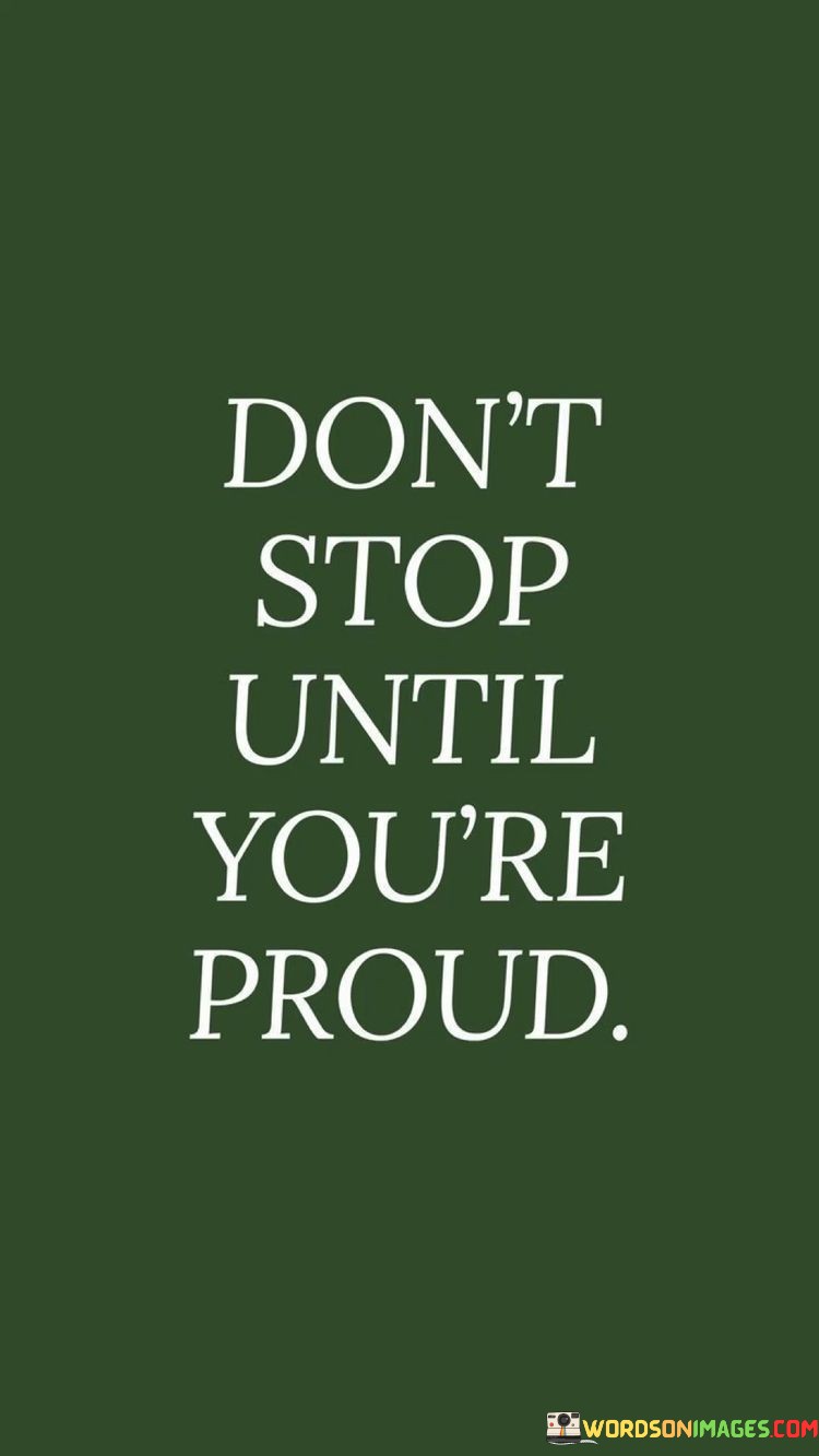 The quote "Don't Stop Until You're Proud" is a motivational message that encourages perseverance and a commitment to personal excellence. It emphasizes the idea that one should continue working towards their goals and aspirations until they reach a level of achievement that fills them with a deep sense of pride and satisfaction.
