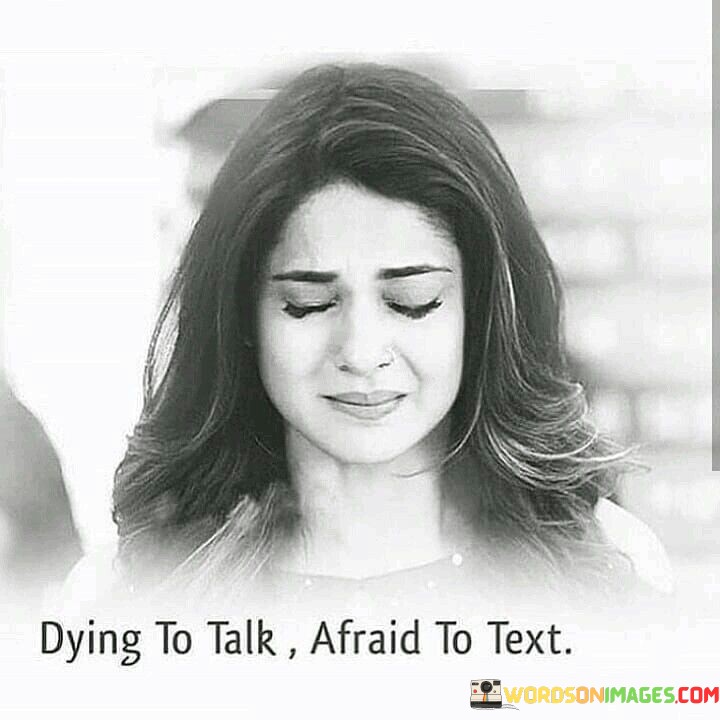 The quote "Dying to Talk, Afraid to Text" captures the struggle many people face in modern communication. It suggests that while we may yearn for deep and meaningful conversations, we often hesitate to initiate them through text messages due to fear or uncertainty.