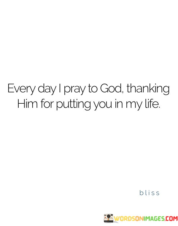 This quote expresses a deep sense of gratitude and appreciation for someone who holds a special place in the speaker's life. It suggests that the person is so cherished and valued that the speaker regularly prays to God in thanksgiving for their presence.