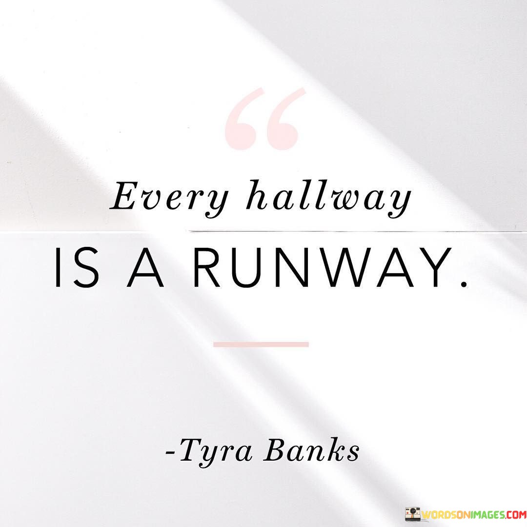 This quote encourages us to break free from self-doubt and insecurity and embrace the spotlight, even in the most unexpected places. It's a reminder that confidence and self-expression are not limited to formal stages but can shine in the everyday moments of our lives. So, strike a pose and remember that "Every Hallway Is A Runway" for your unique style and charisma.
