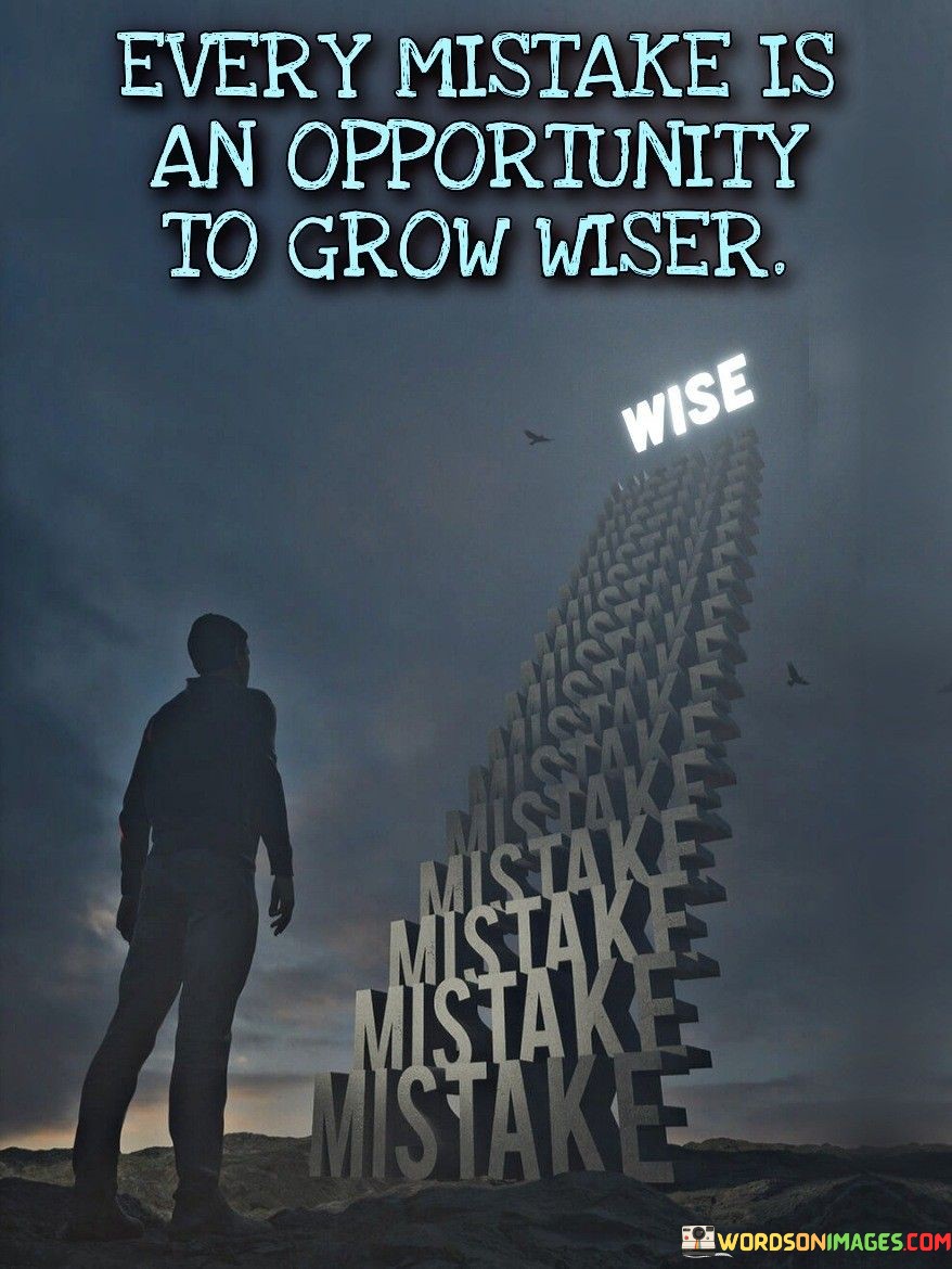 The quote, "Every mistake is an opportunity to grow wiser," reflects the profound idea that errors and missteps in life are not failures to be feared or avoided but valuable opportunities for learning, growth, and personal development. Mistakes are an inherent part of the human experience, and rather than being sources of shame or regret, they hold the potential to provide us with valuable insights and lessons. When we make mistakes, we are confronted with the consequences of our actions or decisions. This moment of realization serves as a powerful catalyst for self-reflection and introspection. It encourages us to examine our thought processes, behaviors, and motivations, gaining a deeper understanding of ourselves and our patterns. Through this process, we identify areas for improvement and growth, allowing us to make more informed choices in the future. Moreover, mistakes often push us out of our comfort zones and challenge us to adapt and innovate. They prompt us to think creatively, seek alternative solutions, and develop resilience. As we navigate the aftermath of our errors, we build a sense of perseverance and determination, strengthening our ability to face future challenges with greater courage and composure. Additionally, mistakes can foster humility and empathy. When we acknowledge our fallibility, we become more empathetic toward the errors of others, recognizing that nobody is perfect. This understanding deepens our interpersonal connections and allows us to offer support and encouragement to those who may be experiencing similar difficulties. Embracing mistakes as opportunities for growth also reduces the fear of failure, encouraging us to take calculated risks and pursue our aspirations. Rather than viewing setbacks as reasons to give up, we approach them with a growth mindset, seeing the potential for learning and improvement in each experience. In conclusion, the quote advocates for a transformative perspective on mistakes, positioning them as stepping stones to wisdom and self-improvement. By recognizing that every error offers a chance to learn, grow, and evolve, we shift our attitude toward failure and develop resilience, empathy, and a greater understanding of ourselves and others. Embracing mistakes as valuable opportunities allows us to navigate life's challenges with a growth mindset, fostering continuous learning and personal development. Ultimately, it is through the journey of learning from our mistakes that we become wiser, more compassionate, and better equipped to navigate the complexities of life.