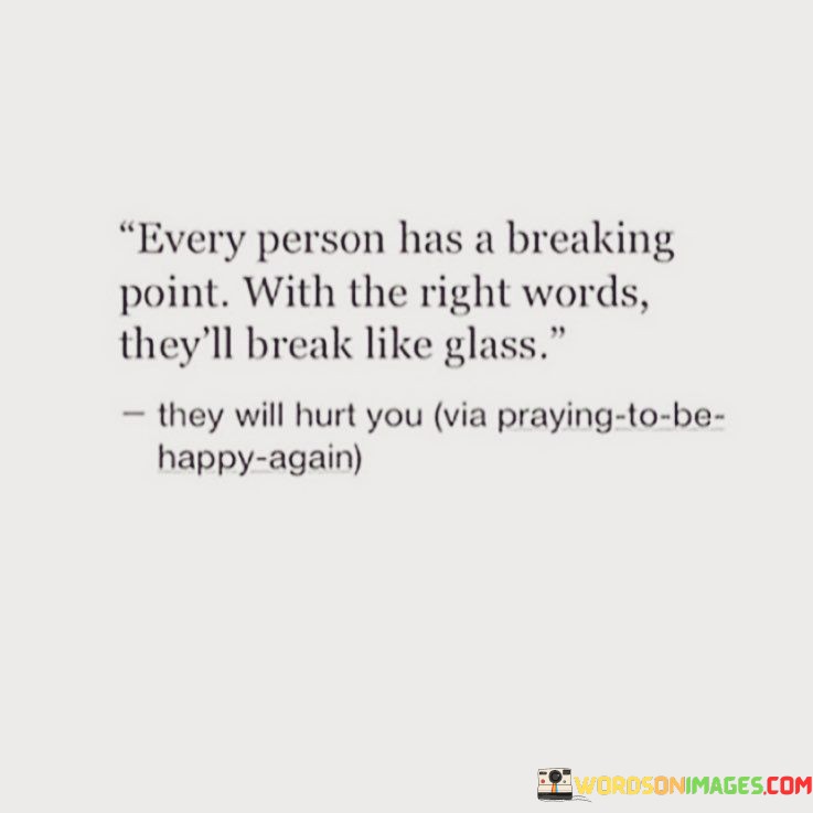 The quote underscores the potential for emotional vulnerability in every individual. "Breaking point" signifies a threshold of emotional resilience. "Break like glass" conveys fragility. The quote emphasizes the impact that carefully chosen words can have on someone's emotions, highlighting the potential for harm.