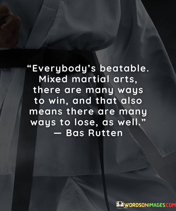 The statement suggests that in MMA, no competitor is invincible, highlighting the potential for anyone to be defeated. It emphasizes that victory can be achieved through diverse strategies and techniques, but conversely, there are also multiple paths to defeat.