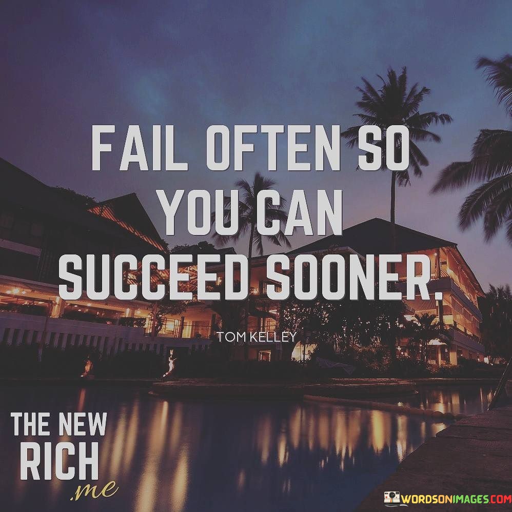 The phrase "Fail often so you can succeed sooner" encapsulates the idea that embracing failures is a stepping stone to achieving success more rapidly.