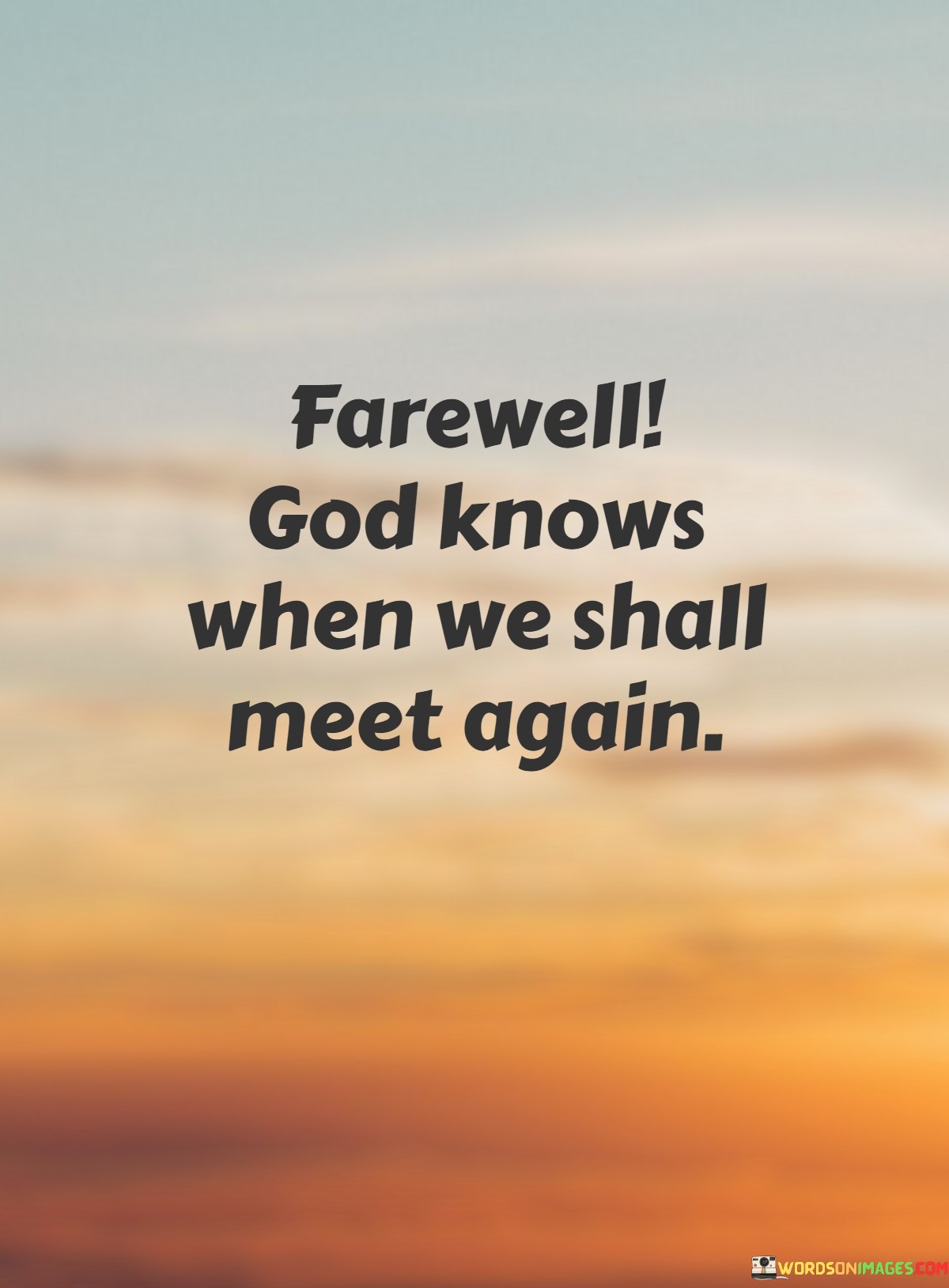 Saying goodbye, unsure of the next meeting time, holds a deep sense of uncertainty and emotion. Farewell marks a temporary separation, and the phrase "God knows when we shall meet again" reveals the uncertainty of the future encounter. It acknowledges the unpredictable nature of life and the passage of time. The phrase conveys the idea that only a higher power knows when destiny will bring people together once more.
