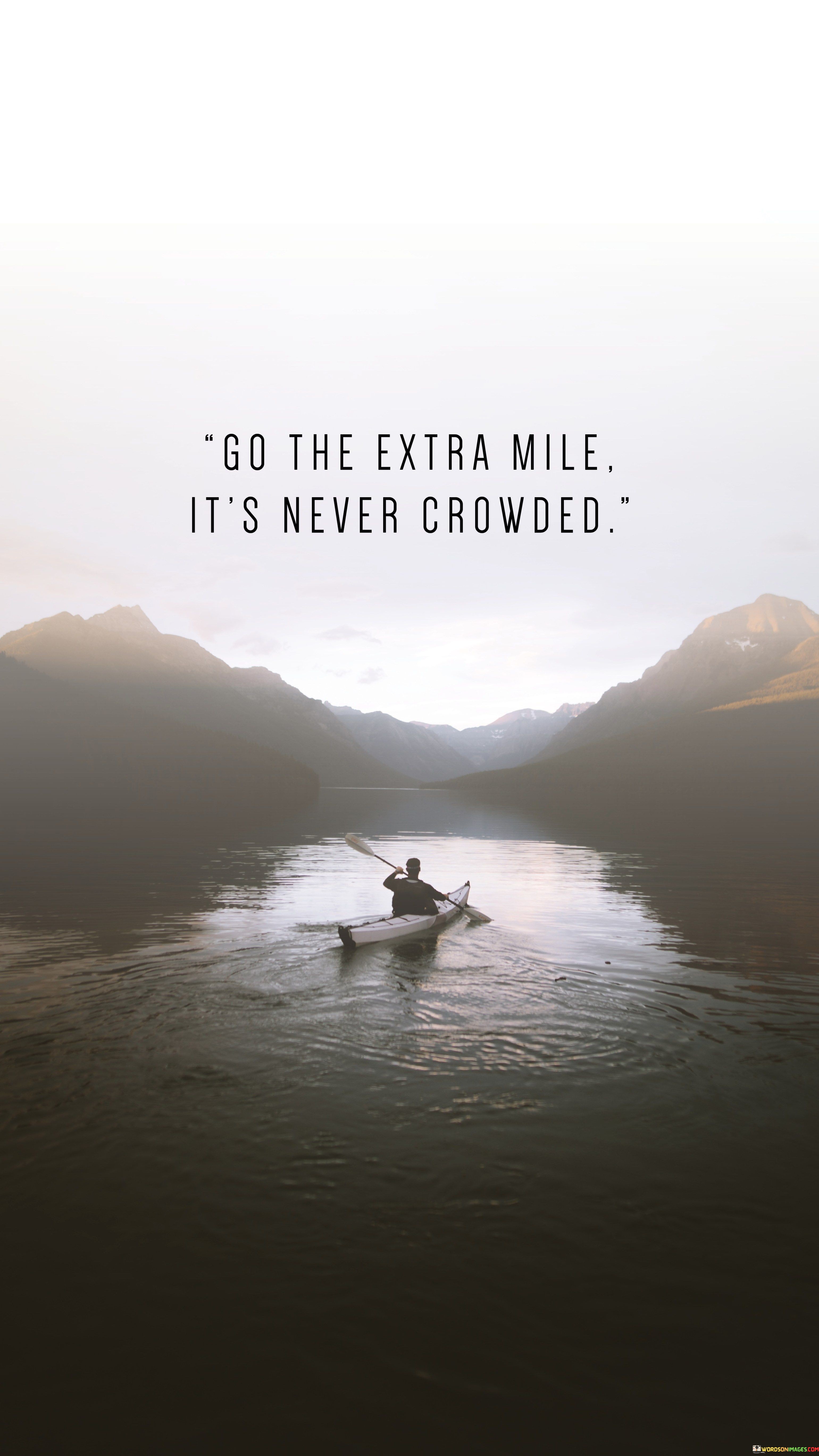 The quote "Go the extra mile; it's never crowded" encourages us to put in extra effort and strive for excellence in our endeavors. When we go the extra mile, it means we're willing to do more than what's expected or required. The phrase "it's never crowded" suggests that not many people choose to put in that additional effort, so those who do stand out and often find success.