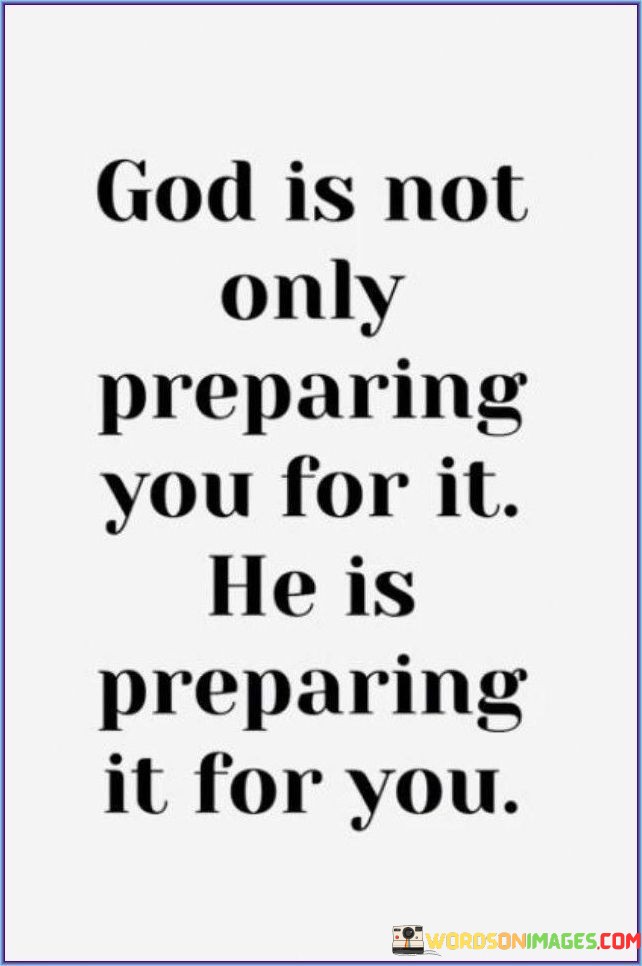 The quote "God Is Not Only Preparing You For It, He Is Preparing It For You" conveys a message of divine preparation and orchestration. It suggests that God's work extends beyond preparing individuals for certain life experiences; He is also actively preparing those circumstances, opportunities, or blessings specifically for them.