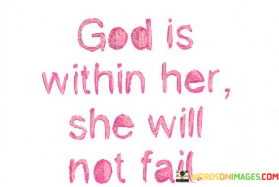 The statement "God Is Within Her She Will Not Fail" is a message of empowerment and faith. It conveys the belief that when God is present within an individual, providing guidance, strength, and support, that person can face challenges and obstacles with confidence, knowing that failure is not an option.