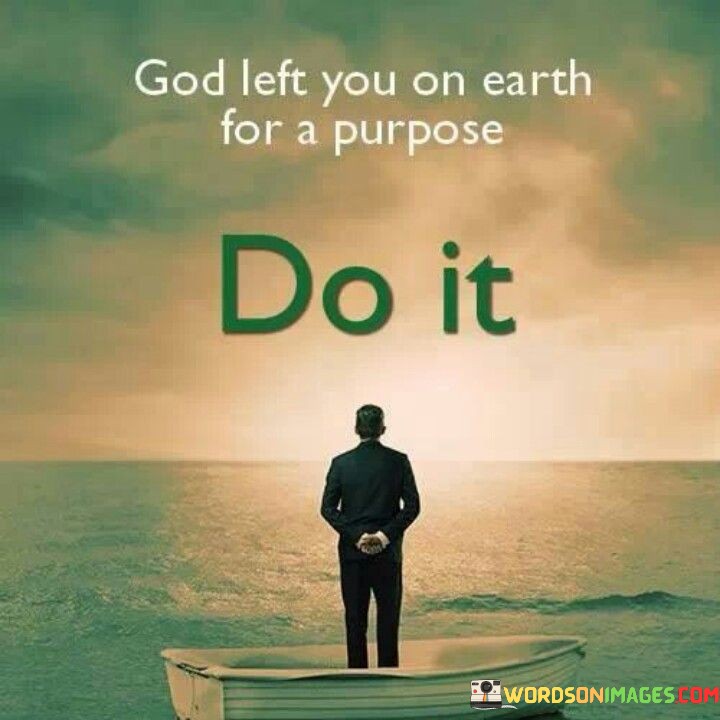The quote "God left you on Earth for a purpose, do it" conveys a powerful message about the significance of one's life and the responsibility to fulfill a unique purpose or calling. It suggests that each individual has a divine reason for being here on Earth, and it is their duty to discover and carry out that purpose.