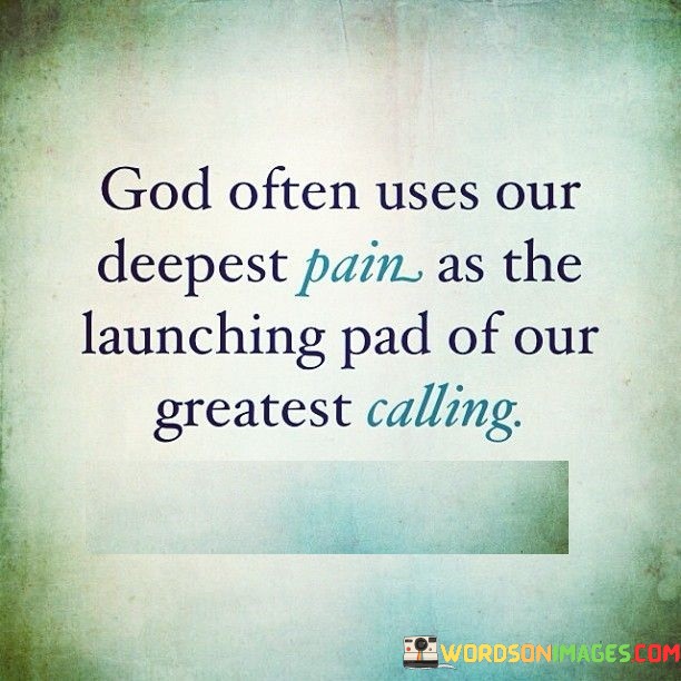 The quote "God often uses our deepest pain as the launching pad of our greatest calling" conveys a message of hope, resilience, and the belief that difficult and painful experiences in life can ultimately lead to discovering one's true purpose or calling.