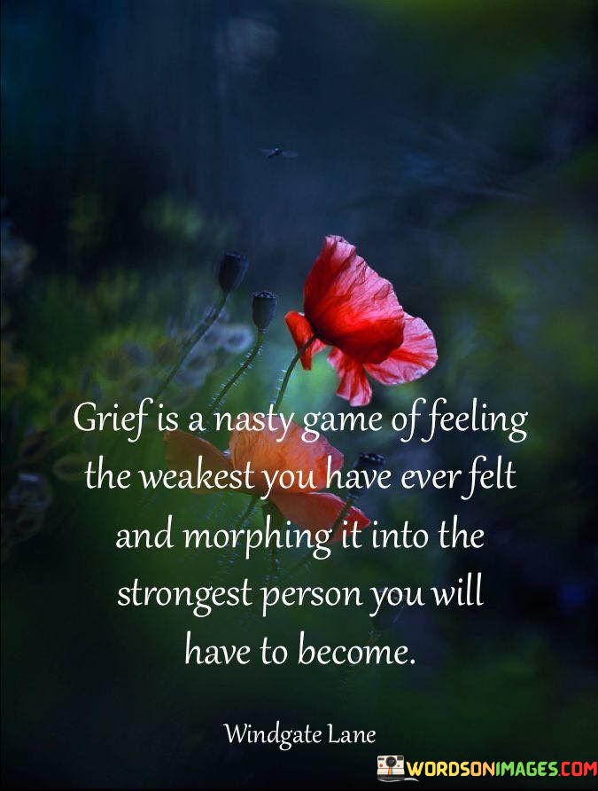 The quote underscores the paradox of grief. It reflects the initial vulnerability and emotional upheaval it brings. "Strongest person you will have to become" signifies the eventual transformation and the strength that emerges from adversity.