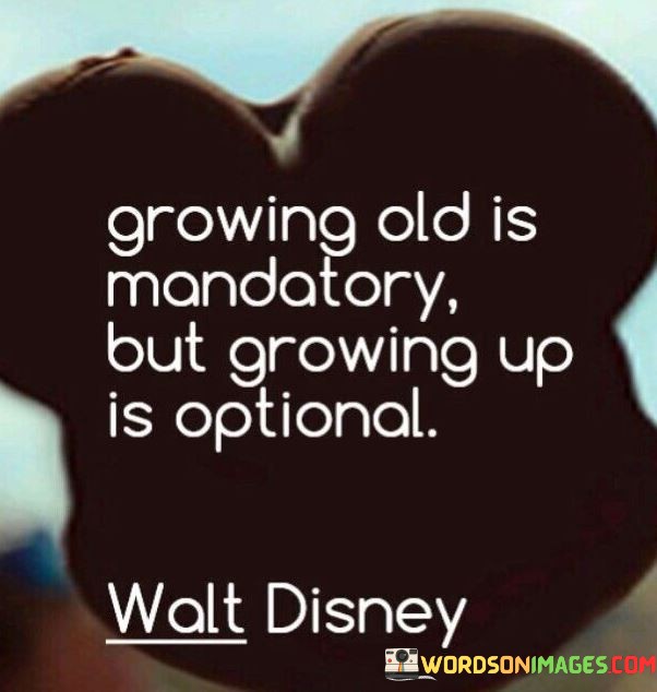 In essence, the quote emphasizes that while we all must undergo the process of aging, we have the freedom to choose our outlook on life. We can opt to remain youthful at heart, finding joy in simple pleasures and maintaining a playful approach. Alternatively, we can embrace the maturity that comes with experience and tackle life's demands with seriousness. The choice between merely growing older and actively growing up rests in our hands.