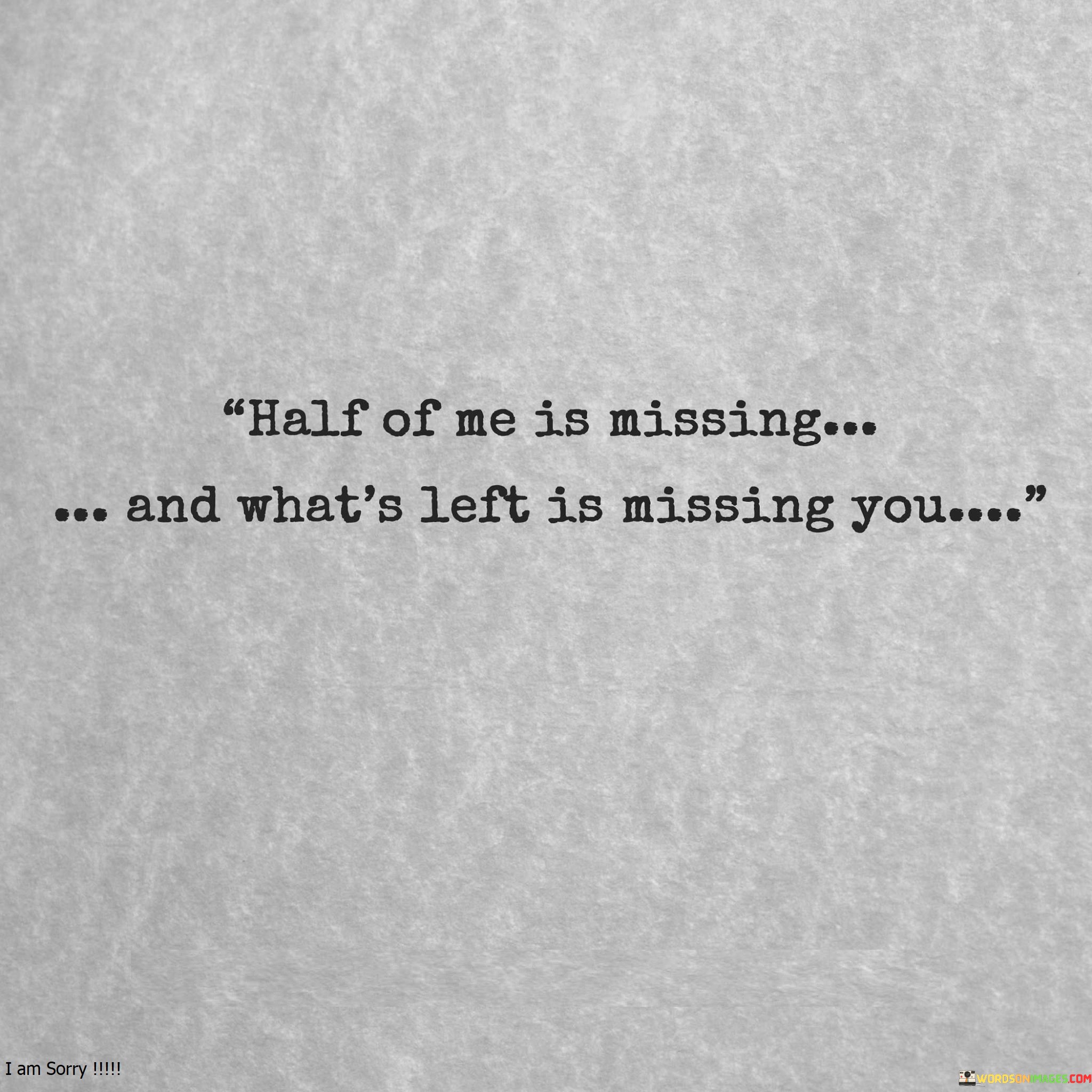 The quote reflects on the profound sense of incompleteness caused by absence. "Half of me is missing" conveys emptiness. "What's left is missing you" signifies the continued longing. The quote captures the emotional void created by separation.