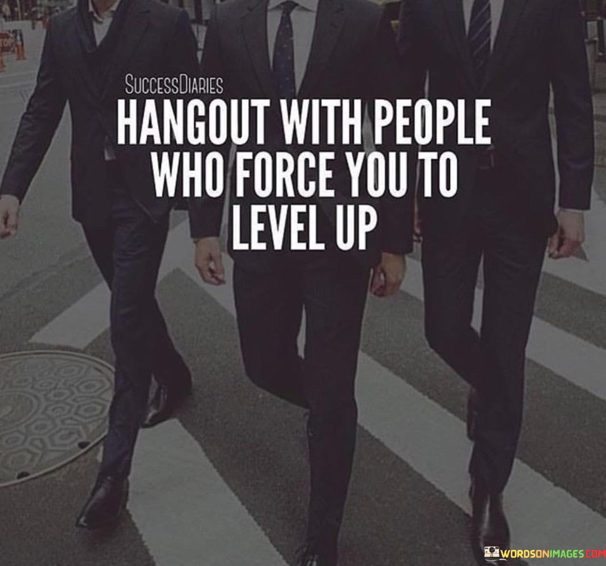 The phrase "Hangout with people who force you to level up" suggests that our social circle plays a significant role in our personal development. It implies that being around individuals who are ambitious, motivated, and constantly pushing their own limits can motivate us to do the same.
