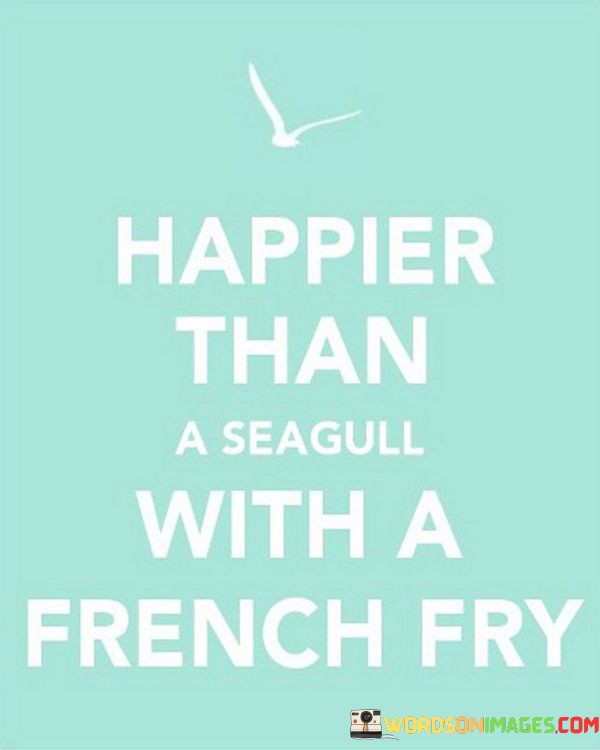 The quote "Happier Than A Seagull With A French Fry" means being extremely joyful or delighted. Imagine a seagull finding a tasty French fry – it's like winning a little lottery for the seagull. So, when someone says this phrase, they're comparing their happiness to that seagull's excitement over a delicious treat.