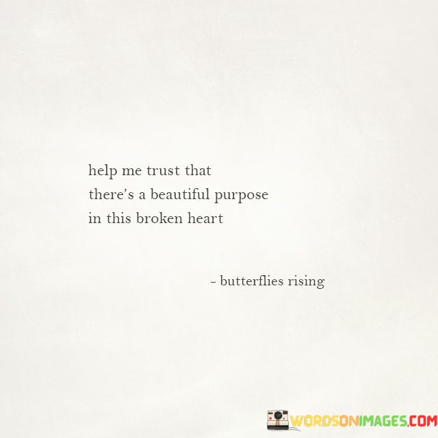 This quote encourages finding meaning in heartbreak. It urges us to trust that even amidst pain, there's a beautiful purpose. It suggests that our broken hearts can lead to growth, resilience, and a deeper understanding of life's complexities. It's an empowering reminder that adversity can ultimately contribute to our personal evolution and reveal profound beauty.