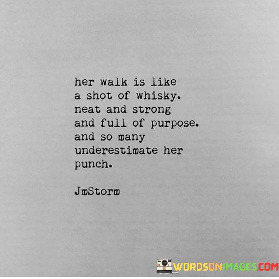 This quote vividly describes the commanding presence and underestimated power of a woman's walk. It draws a captivating analogy between her walk and a shot of whisky—neat, strong, and purposeful. The quote suggests that her stride exudes confidence, determination, and intention. It symbolizes her unwavering commitment to her goals and the unyielding strength she possesses within. However, many underestimate the impact she can make. This quote highlights the tendency for others to underestimate her capabilities, perhaps due to preconceived notions or biases. The metaphorical "punch" that she delivers refers to her ability to exceed expectations and surprise those who underestimate her. It serves as a testament to her hidden power and resilience, which may catch others off guard. This quote celebrates the woman's ability to defy expectations, challenge stereotypes, and showcase her undeniable strength. Despite being underestimated, she confidently moves forward, leaving a lasting impression on those who witness her walk. It serves as a reminder that appearances can be deceiving and that true strength often lies beneath the surface. The quote encourages others to recognize the power and determination that resides within her, acknowledging that her impact can be far greater than initially assumed. Ultimately, it celebrates the woman's ability to command attention and surpass expectations with her purposeful walk, leaving a lasting impression that cannot be easily forgotten.