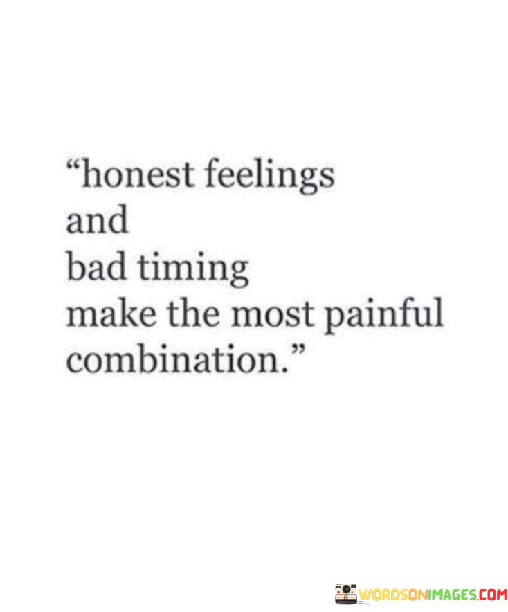 The quote reflects on the complexity of emotions and timing. "Honest feelings" implies genuine sentiments. "Bad timing" suggests unfortunate circumstances. The quote conveys that the collision of true emotions with unfavorable timing leads to deep pain.