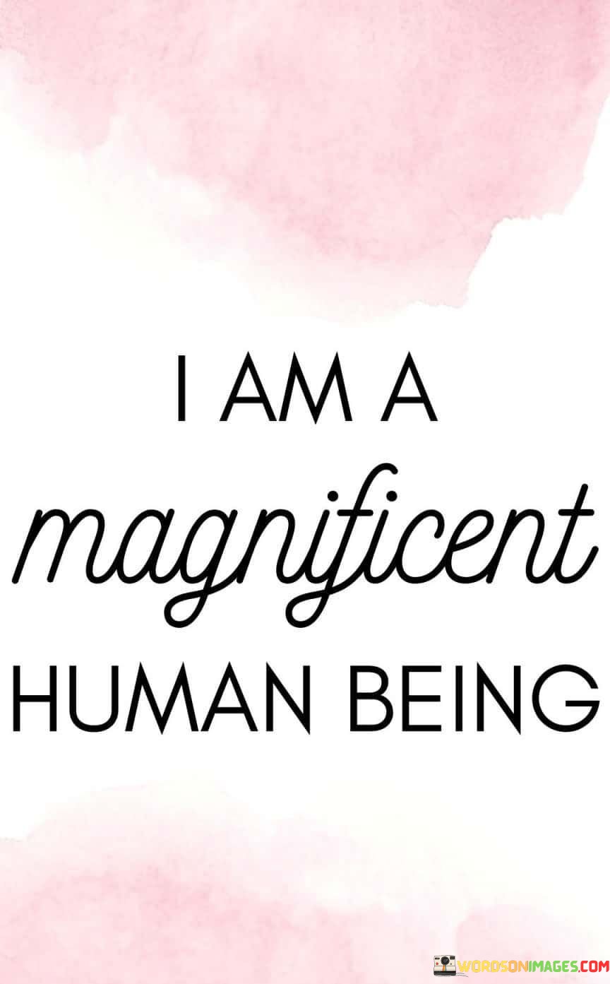 Recognizing my magnificence is not arrogance but a celebration of the incredible potential within every human being. It's a reminder that I am here to make a mark, to leave footprints in the sands of time, and to embrace the gift of life with gratitude and wonder. So, as I journey through this world, I carry with me the knowledge that I am a magnificent human being, and that realization fuels my purpose and ignites my passion for a life well-lived.