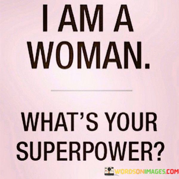 The quote "I am a woman, what's your superpower?" carries a strong feminist message, highlighting the unique strengths and abilities of women and challenging the conventional perception of power. By identifying as a woman, the quote asserts a sense of pride in one's gender identity and celebrates the inherent qualities and capabilities that women possess. The phrase "what's your superpower" suggests that being a woman itself is a superpower, emphasizing the resilience, intelligence, empathy, and countless other qualities that women bring to the table.This quote aims to challenge the traditionally male-dominated narrative of power and superheroes. Historically, superheroes have often been portrayed as male, embodying physical strength, invincibility, and heroism. By asking "what's your superpower," the quote not only challenges the assumption that only men possess extraordinary abilities but also invites individuals to recognize and embrace their own unique strengths and talents.The quote serves as a call to action, encouraging women to be proud of who they are and to unleash their full potential. It challenges societal norms and stereotypes that may limit or underestimate women's capabilities. It seeks to inspire women to own their power, break barriers, and strive for greatness in various fields, whether it be in their personal lives, careers, or contributions to society.