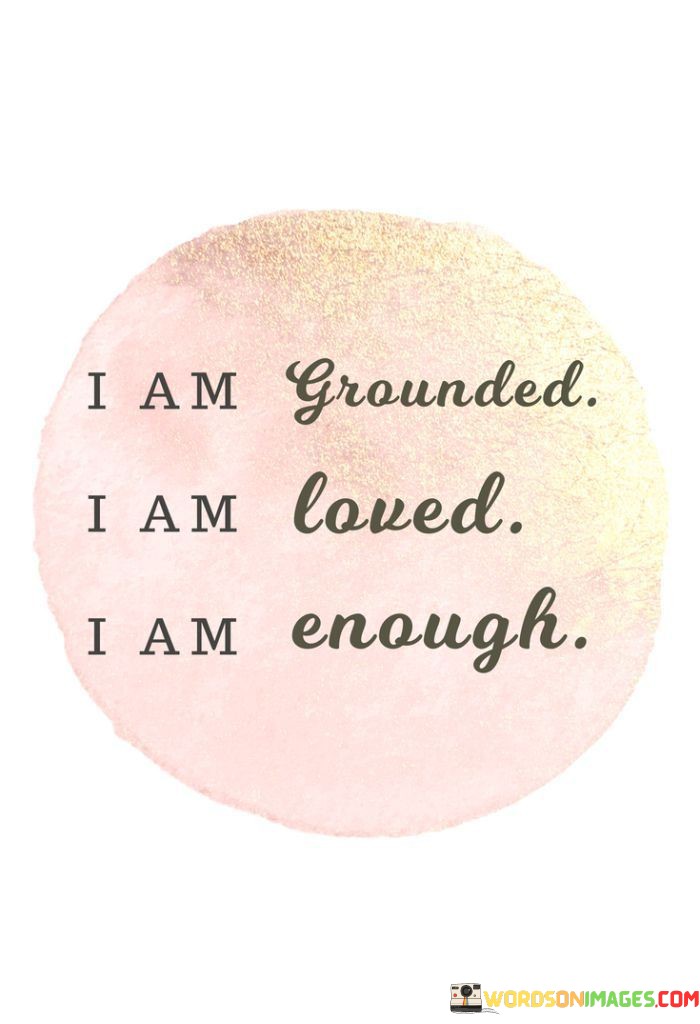 I am secure, valued, and complete. The saying reflects a strong sense of self-worth and self-validation. It implies that being grounded in one's identity, feeling loved, and recognizing one's adequacy contribute to a positive self-image. This quote captures the essence of self-acceptance, emphasizing the importance of recognizing one's worth, feeling loved, and maintaining a sense of stability. It serves as a reminder to embrace these affirmations to foster a healthy self-perception and nurture a positive relationship with oneself.