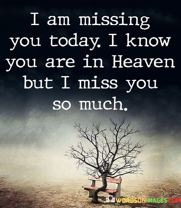 This quote conveys profound grief and longing. The statement "I am missing you today" reflects the ongoing ache of loss, emphasizing the emotional depth of this particular day. Acknowledging the loved one's presence in heaven adds a spiritual dimension, highlighting the enduring connection despite physical separation.