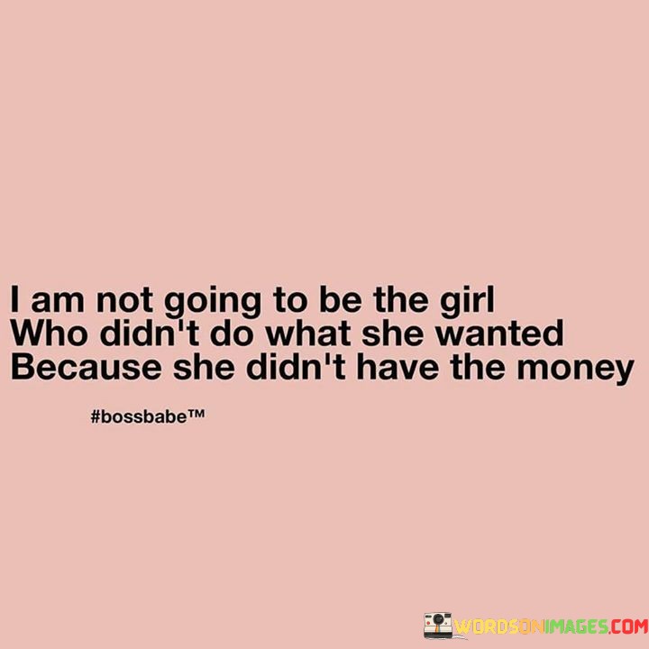 This empowering quote encapsulates a powerful stance against letting financial limitations dictate one's dreams and desires. It conveys the determination to break free from the constraints of monetary obstacles and pursue one's passions unapologetically. The speaker rejects the notion of being defined by her lack of resources or opportunities, refusing to allow financial limitations to rob her of a fulfilling life. Instead, she declares her intention to embrace her ambitions and aspirations fully, unencumbered by the fear of not having enough money. This quote reflects the essence of resilience and self-empowerment, encouraging individuals to focus on their aspirations, dreams, and inner drive, rather than being deterred by external factors like financial barriers. It celebrates the spirit of perseverance and encourages individuals to be the authors of their own destinies, irrespective of their financial standing, ultimately inspiring others to live a life fueled by passion and purpose.