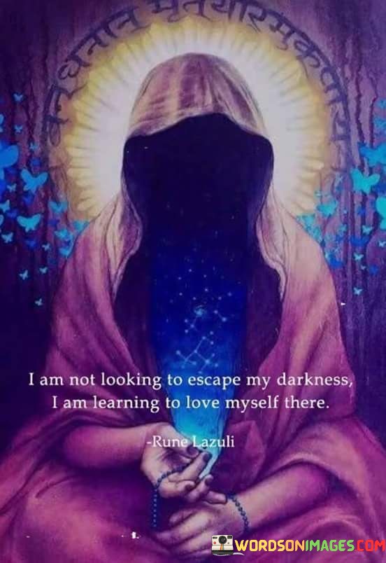 In essence, the quote encapsulates a process of growth. It's about embracing imperfections and finding self-love even in moments of darkness. It portrays a shift from escape to self-acceptance, marking a positive evolution in the speaker's mindset.