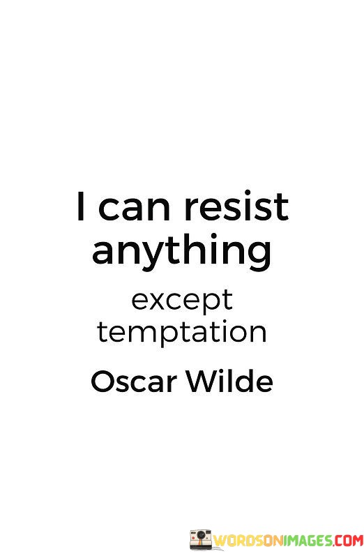 Temptation's allure challenges restraint. The quote captures inner struggle. It's about self-discipline. The speaker implies that while they may resist many things, resisting temptation proves difficult, highlighting the universal challenge of staying steadfast in the face of enticing desires.